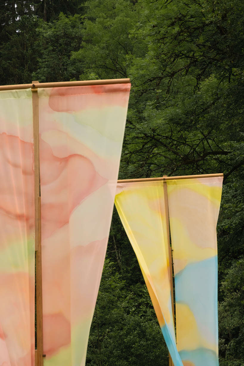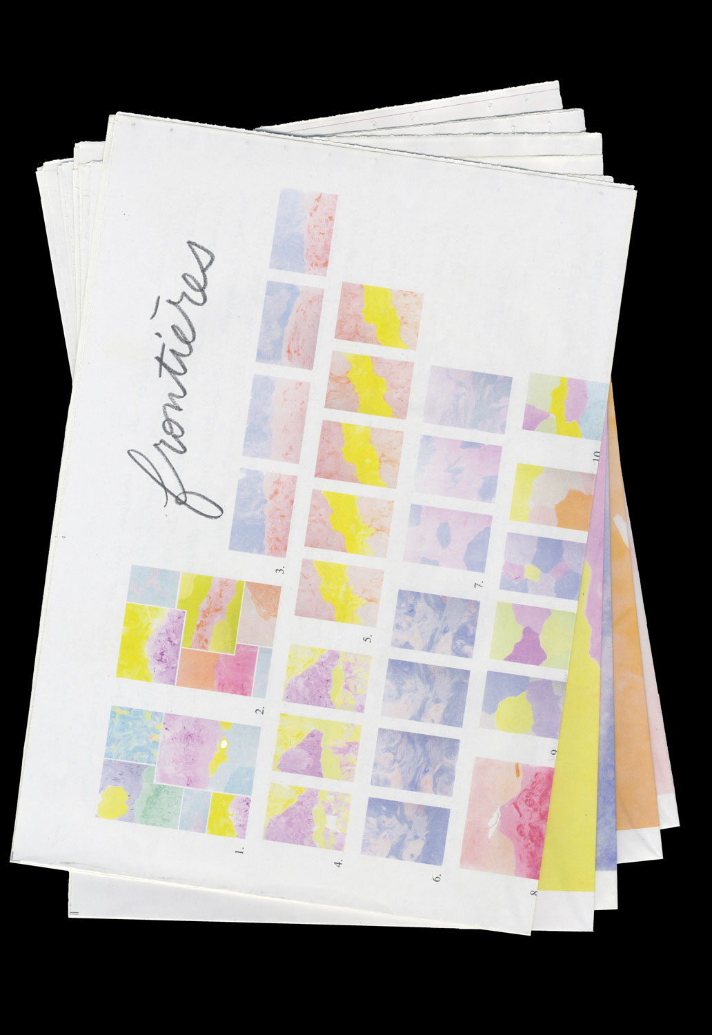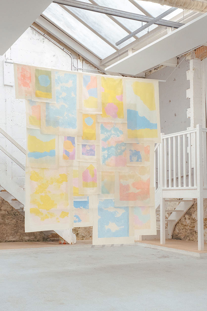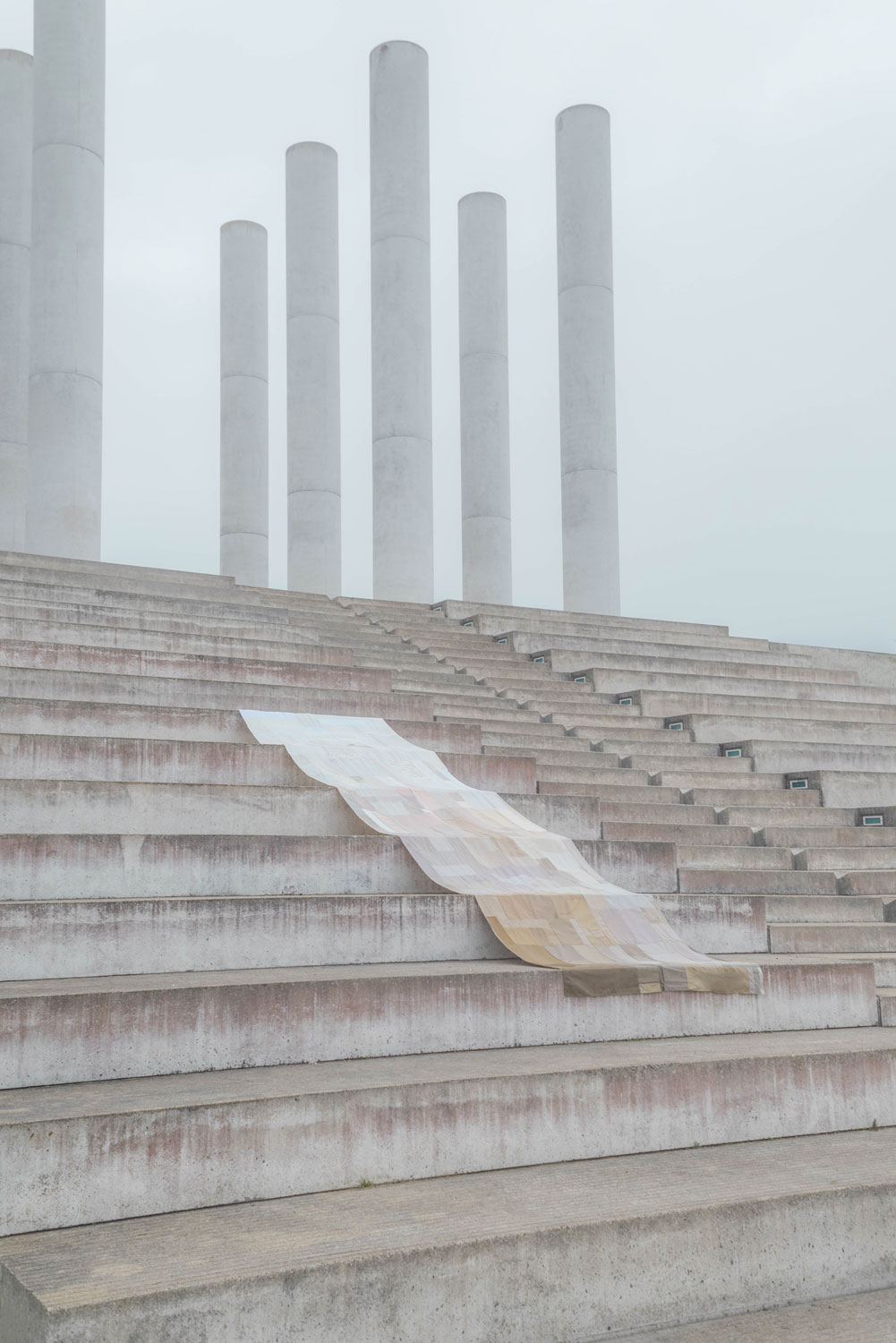 Je mélange un langage emprunté à une culture de l’image industrielle : les couleurs bigarrées se mêlent aux teintes crépusculaires, la précision des dessins aux flous des états de surface, la répétition des compositions au chaos de la profusion. Les supports se multiplient, les étendards en textile, le papier peint, les plaques de pierre, deviennent des éléments constitutifs de leur propre espace. Je vise à rendre une matière inerte, vivante. Sortir ces narrations de l’anonymat est une manière de témoigner d’une humanité qui se révèle au cours du processus de transformation. Ce sont des passerelles qui tendent à leur donner une place dans une archive du présent, une mémoire du futur.