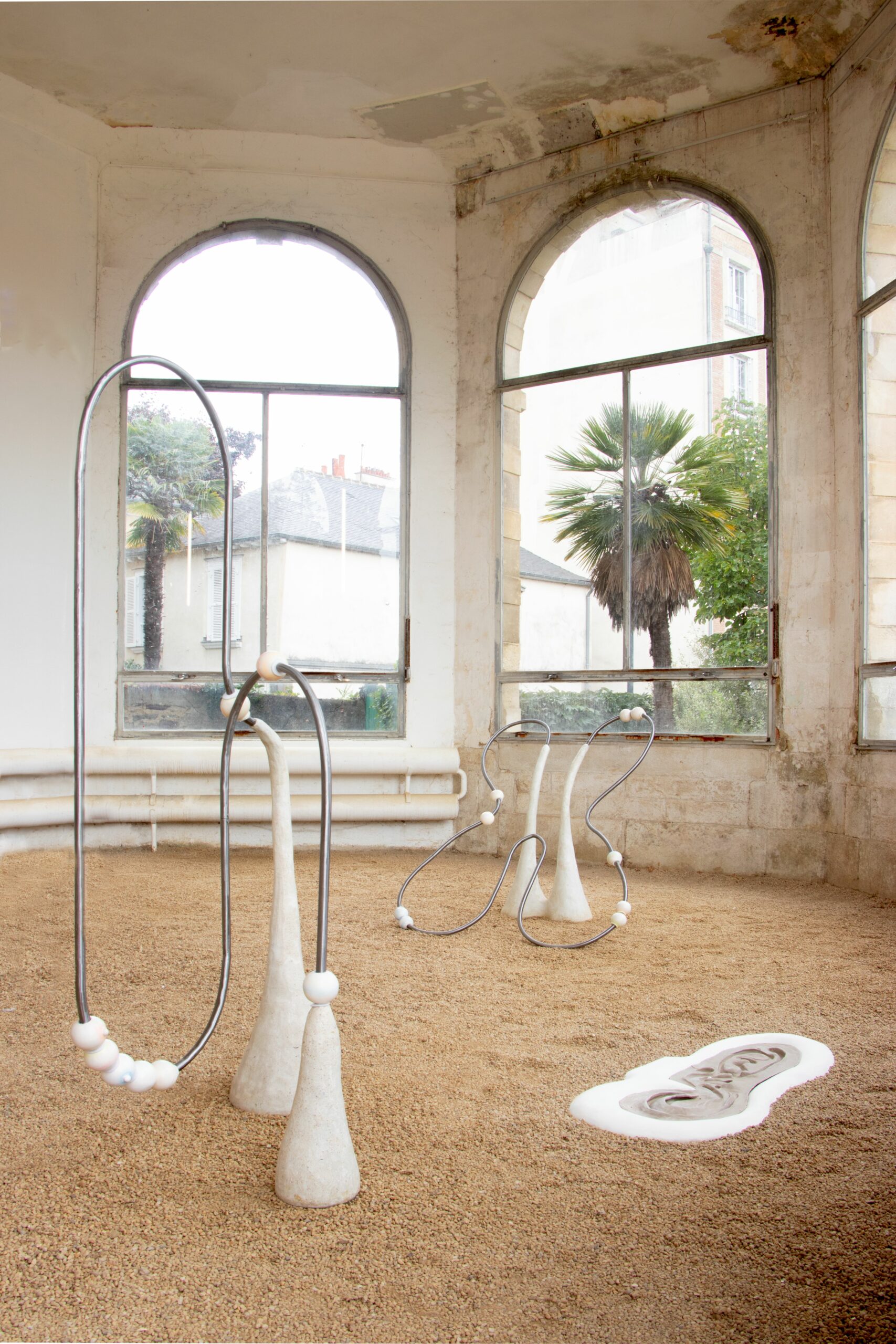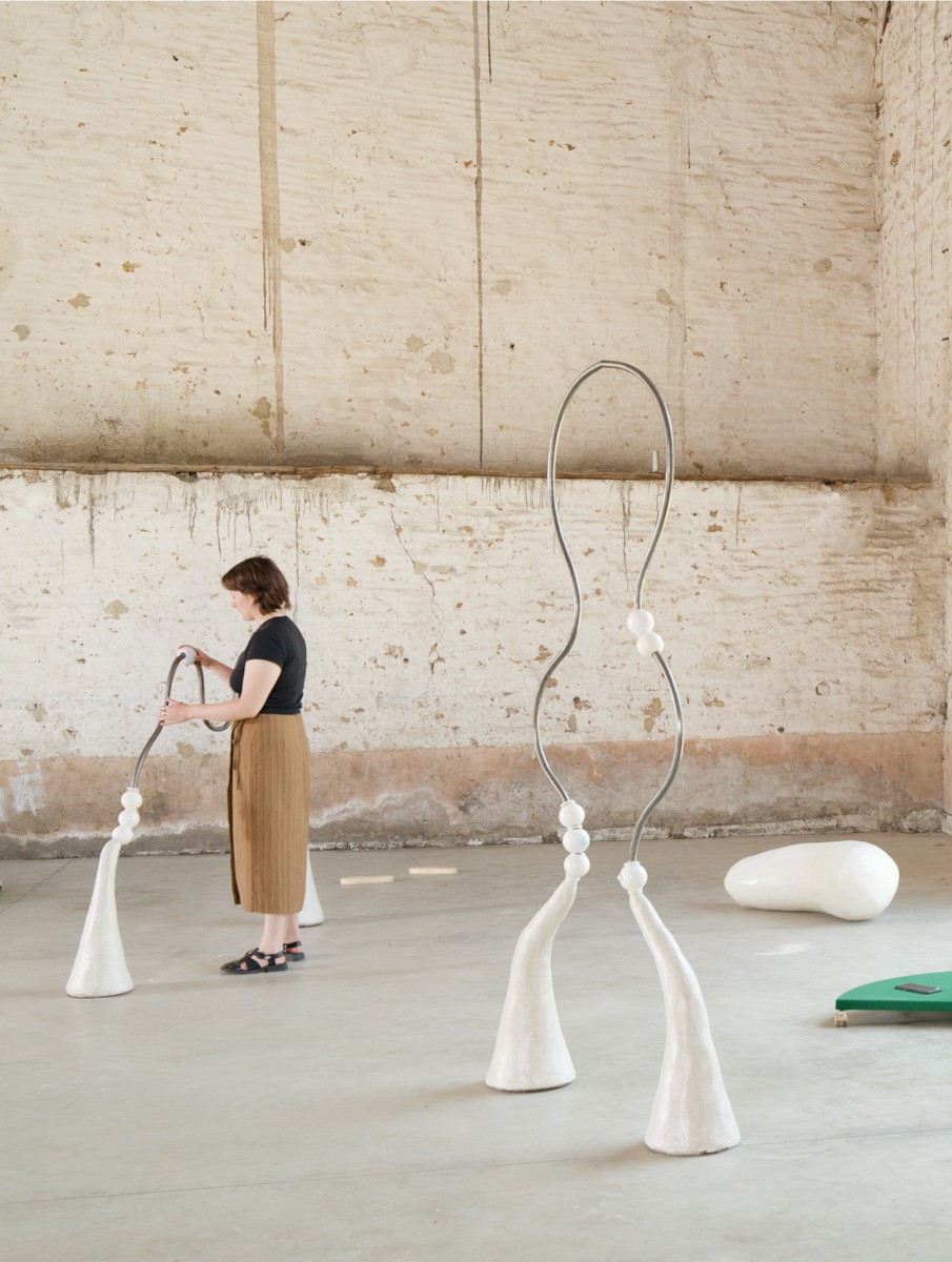 Plus récemment, Louise réalise pour une exposition en plein air l’installation Enfiler des perles (2024). Ici plus de frustration. Le contexte de présentation de l’œuvre permet à chacun·e de jouer avec les perles de béton ou de se suspendre aux barres métalliques. Les enfants s’en donnent à cœur joie. Comme le souligne l’artiste, elles et ils sont souvent plus à l’écoute des envies suscitées par l’installation, conçue en écho aux aires de jeux ou à des mobiliers de fitness urbain. Louise associe ces références formelles à des billes de ciment qui entourent les barres métalliques. L’activité ludique ou sportive rencontre ainsi l’activité créative: on se balance, on enfile des perles, ou on imagine d’autres usages pour cette sculpture-objet. Les possibilités ouvertes par l’invitation faite à tou·tes de s’approprier par leurs actions les formes modelées par les gestes de l’artiste sont multiples: leur exploration promet de joyeuses découvertes partagées.