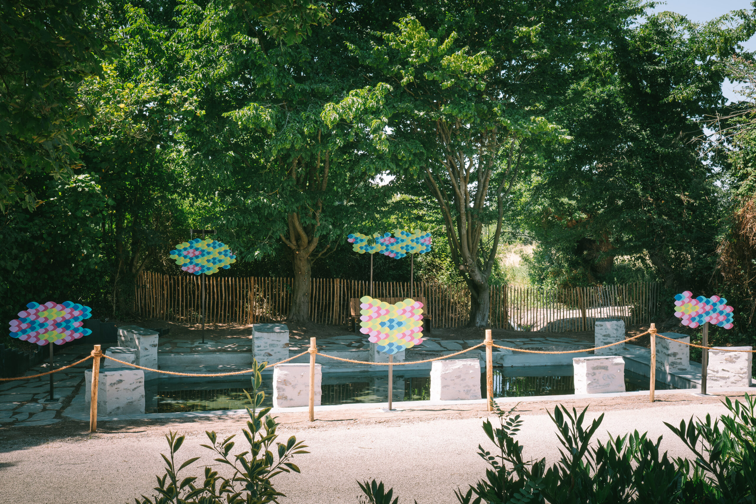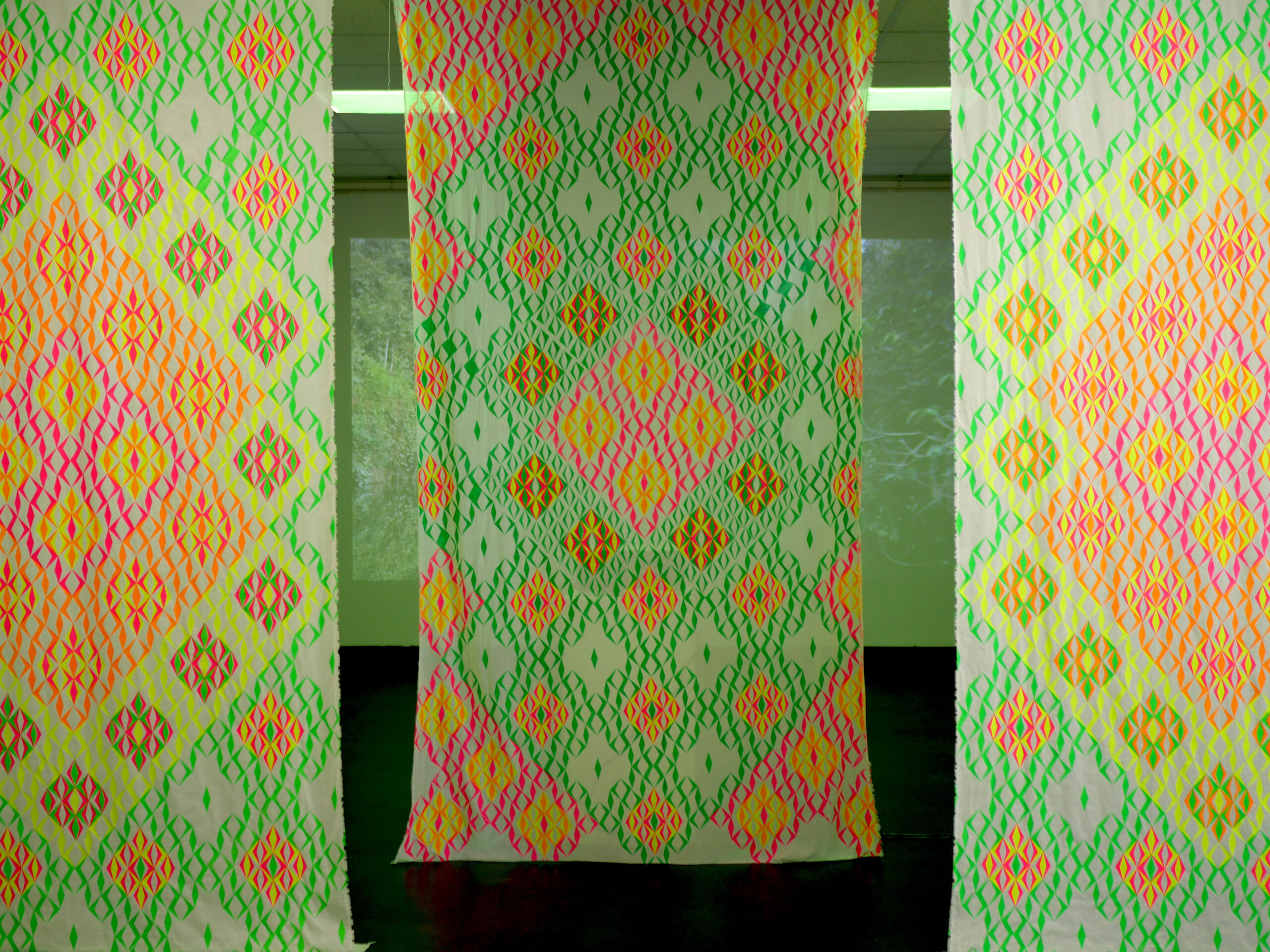 Dans l’ensemble de ma démarche, les textiles et les textes ont une place déterminante. La référence au tissage est omniprésente dans mes oeuvres. Mon travail sur la répétition du motif et l’utilisation de la couleur, s’inspire au départ des textiles des Andes et de l’Amazonie péruvienne, mais également des tissus ayant circulé dans le cadre du commerce colonial. Je m’intéresse aux motifs de ces régions car ils ont des significations bien précises et peuvent avoir le rôle de partitions, de calendriers, de cartes ou de récits. Il s’agit de langages à part entière. Ainsi, je mets en évidence le lien entre tissage et narration, qu’elle soit écrite ou orale. Mes oeuvres s’inspirent depuis ses débuts de contes et de mythes d’origine. Les conteurs et les conteuses, ainsi que les tisserands et les tisserandes, avec leurs histoires orales ou tissées protègent et partagent la mémoire des territoires d’où ils proviennent. Avec cette approche je construis l’ensemble de mes projets avec l’intention de faire apparaître des mémoires partagées, historiques et symboliques.