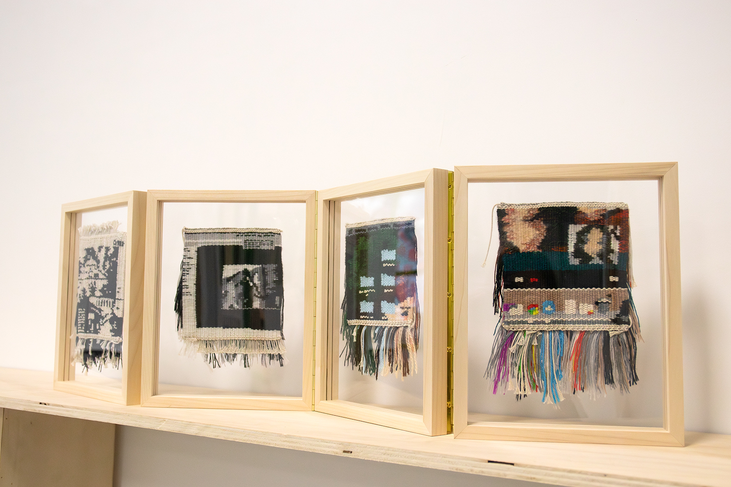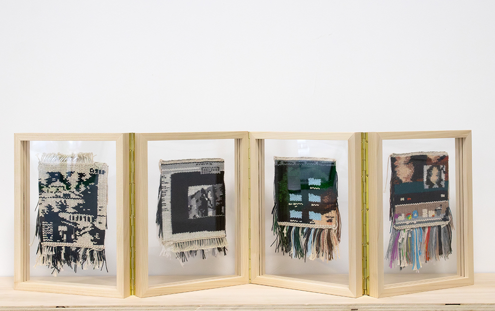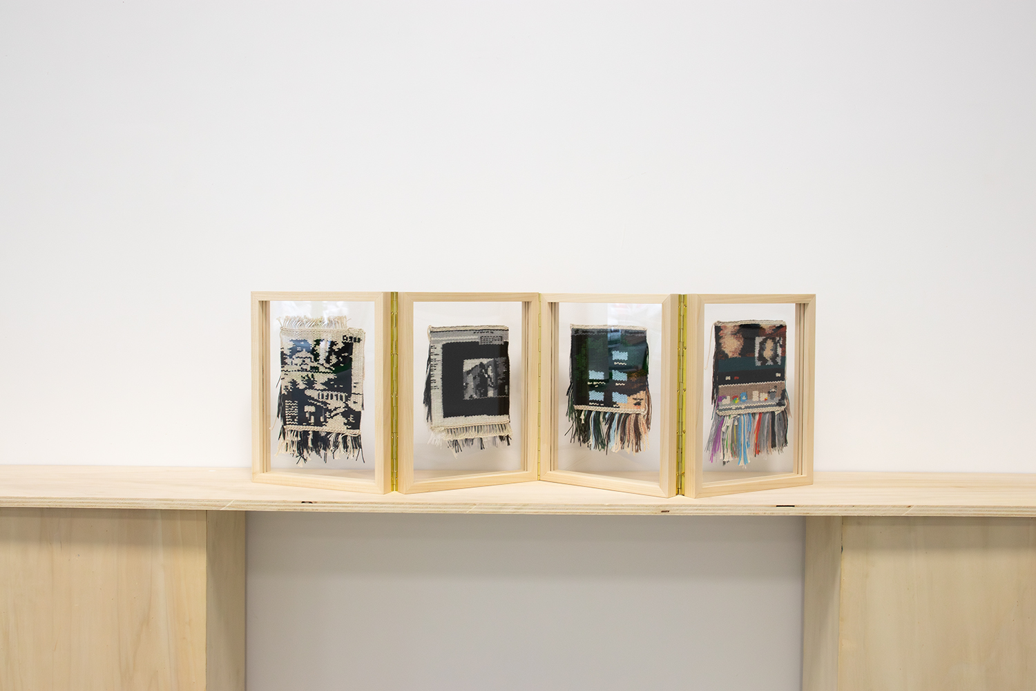 Le leporello est composé de 4 cadres de 200 x 200mm en châtaignier (origine Grand Ouest) pour des œuvres tissées (d’une dimension de 120 x 120mm) montées dans un entre-deux verre Plexiglass pour une meilleure mise en valeur.