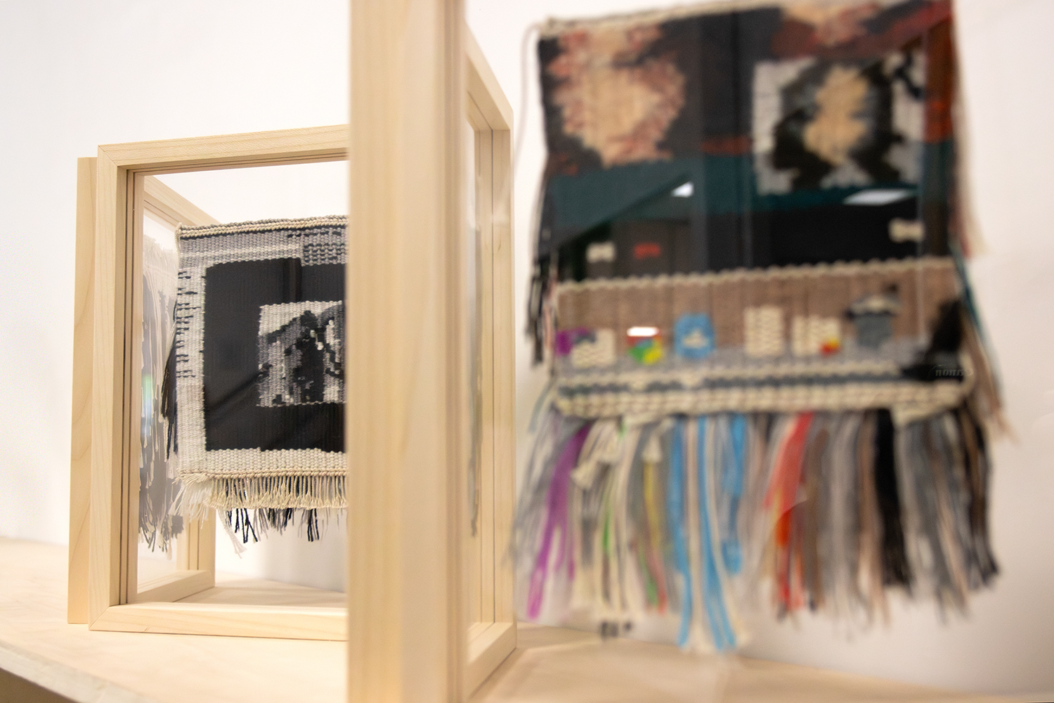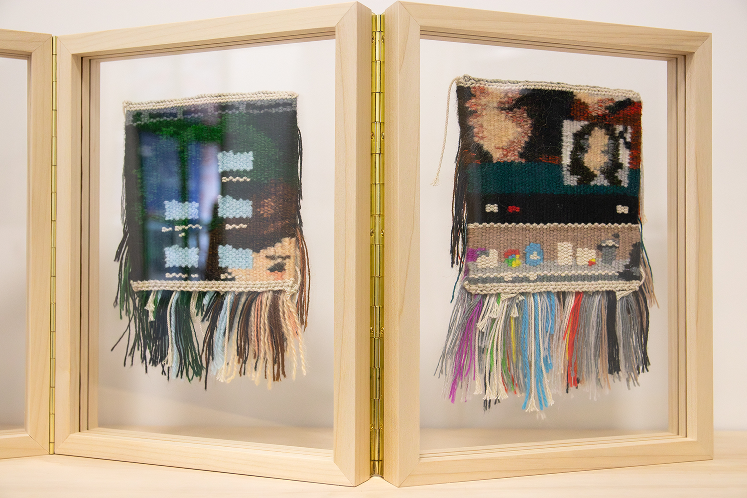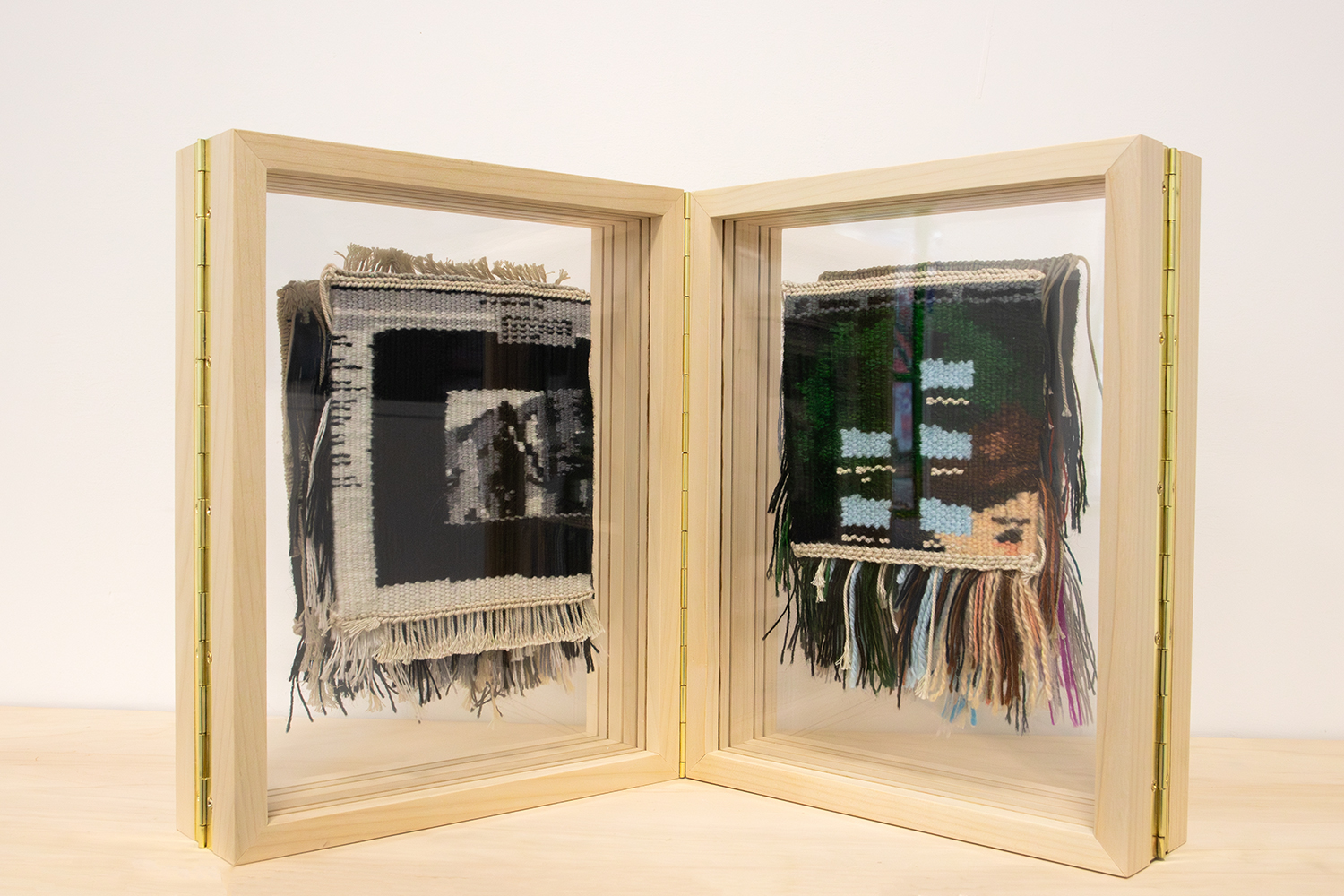 Le leporello est composé de 4 cadres de 200 x 200mm en châtaignier (origine Grand Ouest) pour des œuvres tissées (d’une dimension de 120 x 120mm) montées dans un entre-deux verre Plexiglass pour une meilleure mise en valeur.